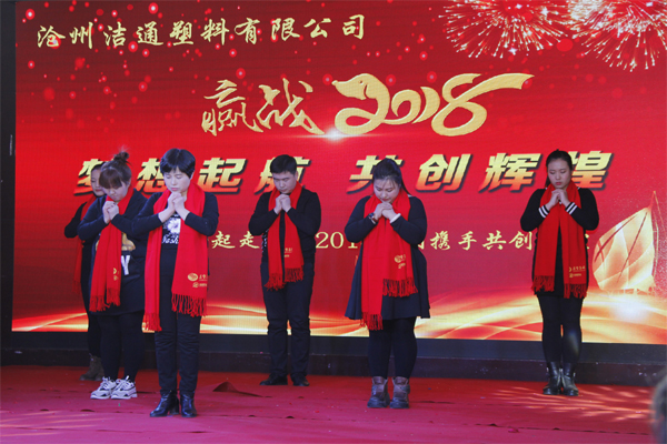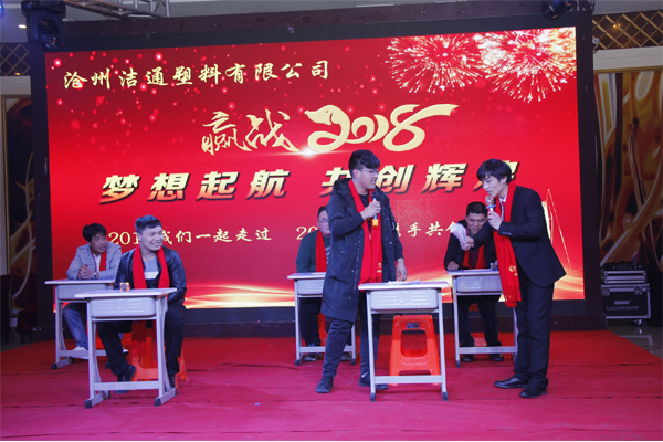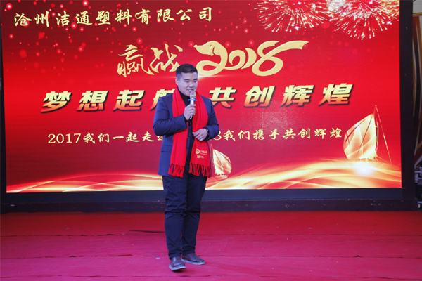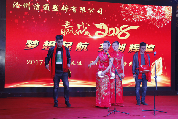 冬去春回又一載,似水流年旺年來。2018年2月12日下午,滄州潔通塑料有限公司2017年年會在正達大西洋酒店隆重舉行。潔通公司全體員工歡聚一堂,在熱情、溫馨、歡樂的氣氛中回首2017年取得的成績,共同迎接2018年的到來。